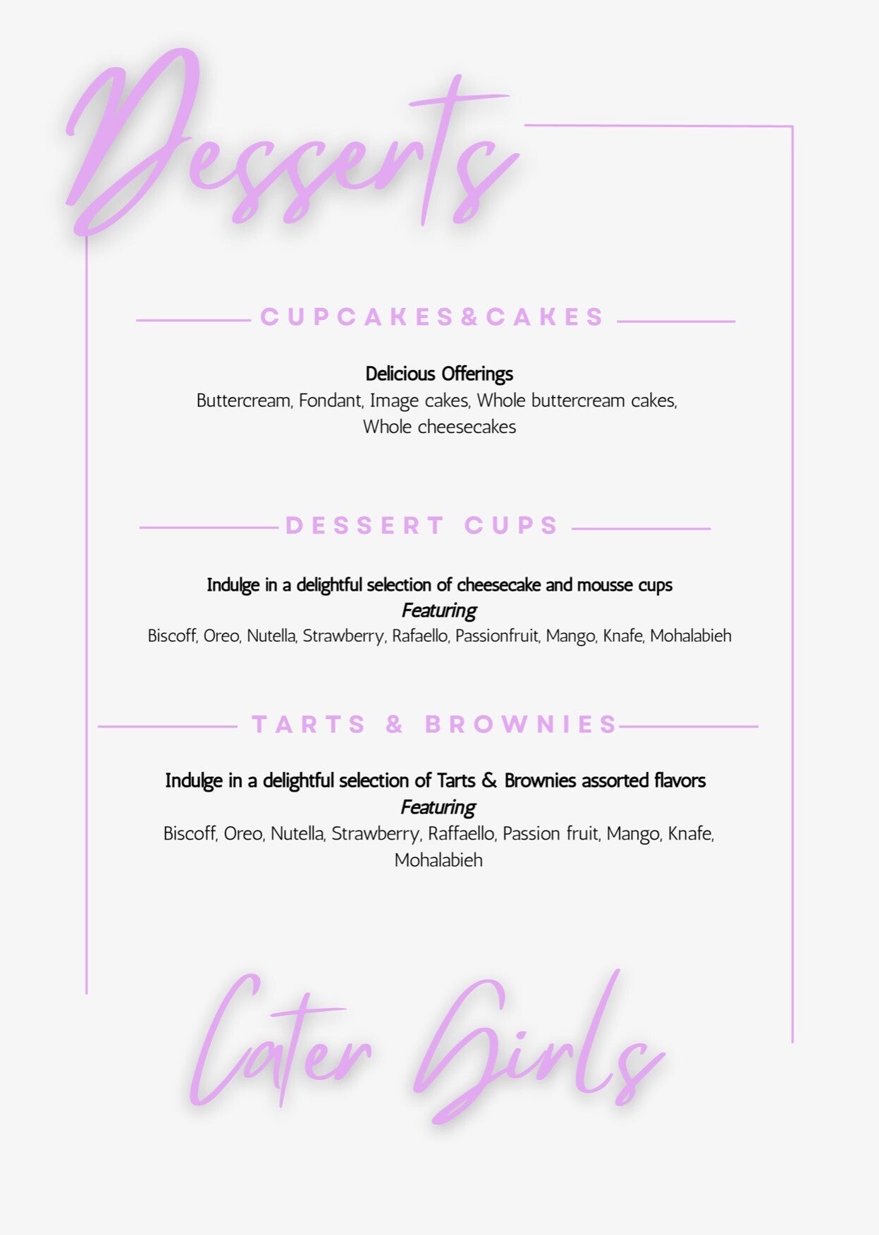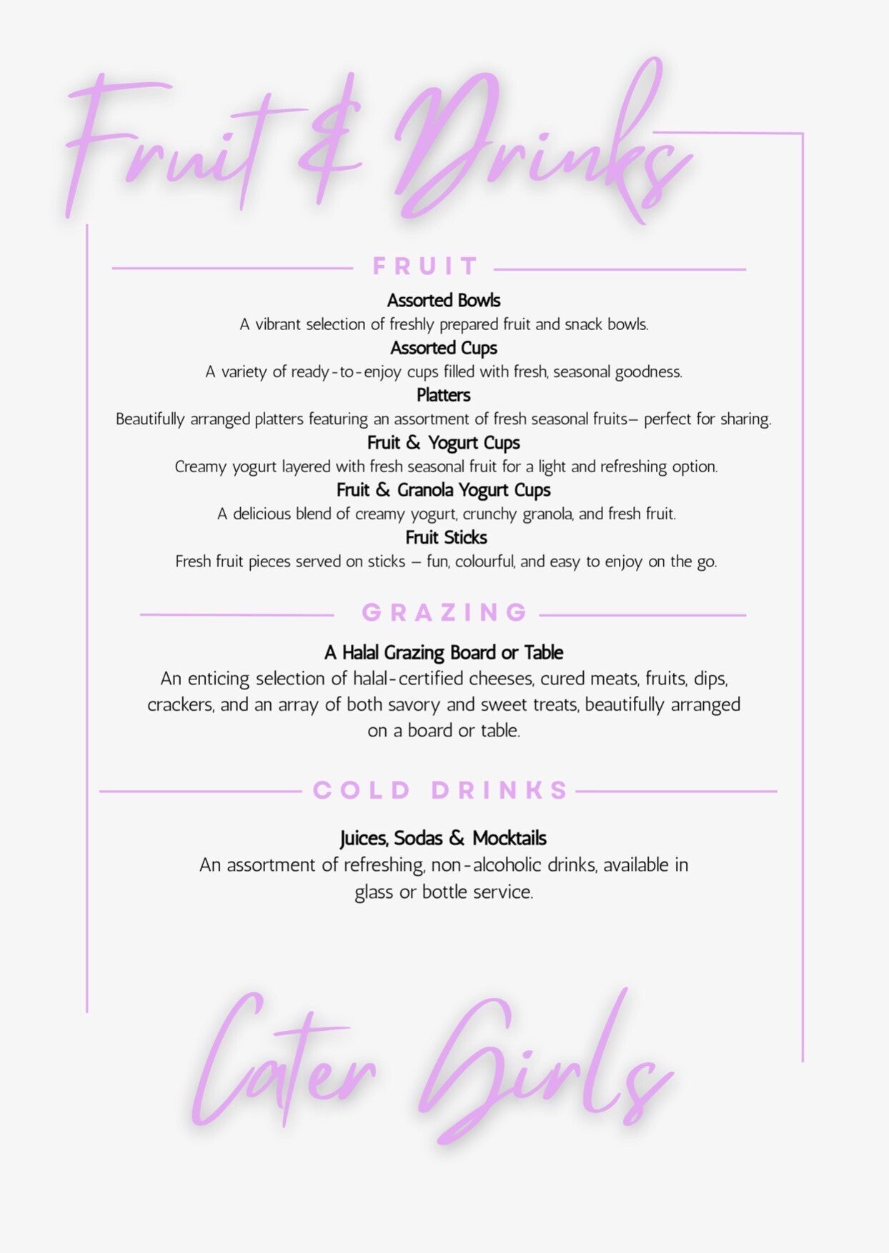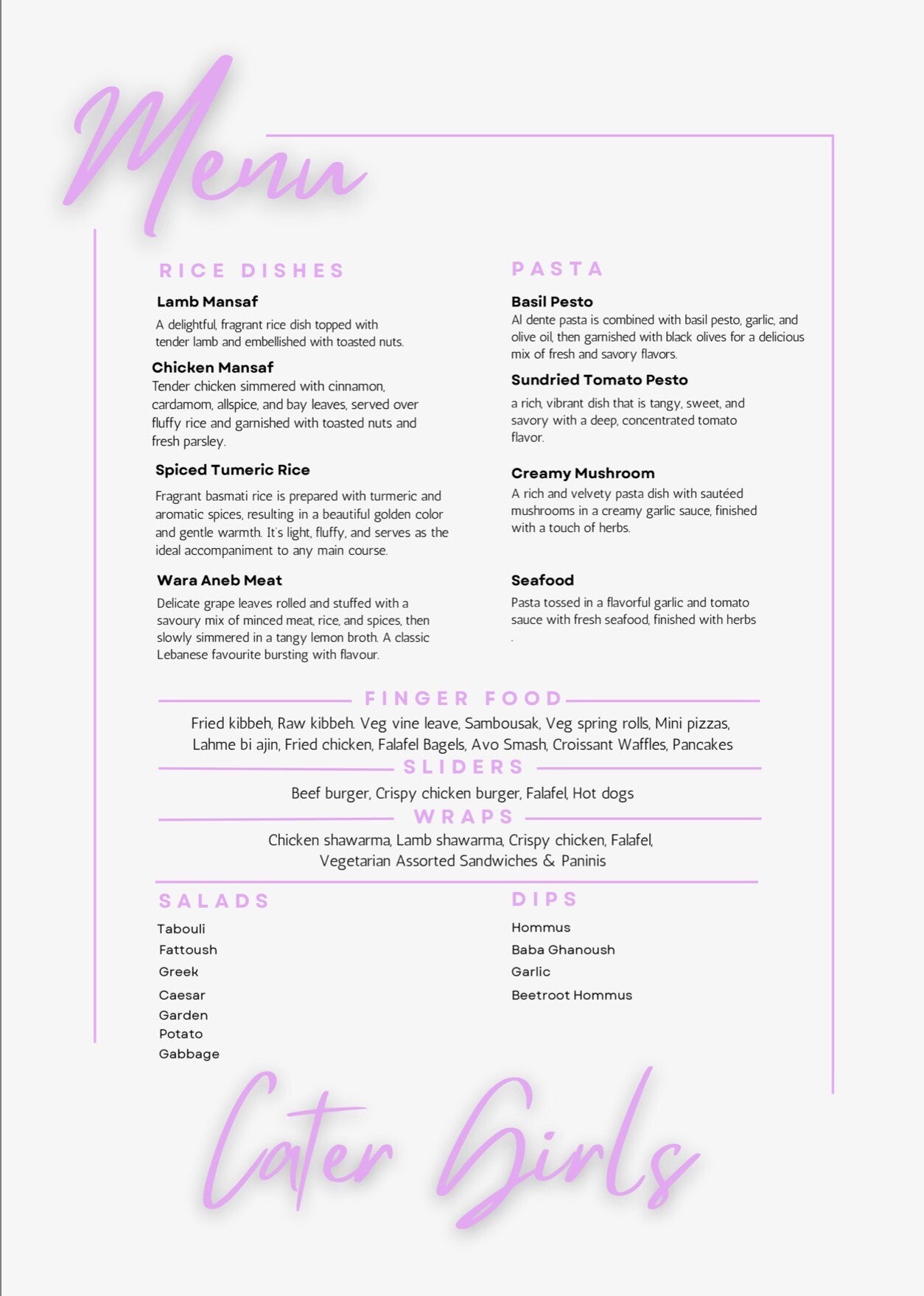 Explore our diverse menu, crafted to showcase the exceptional quality and service that Cater Girls is known for. Each dish is a testament to our commitment to creating memorable culinary experiences. We aim to gain new customers and encourage orders through the quality of the product.